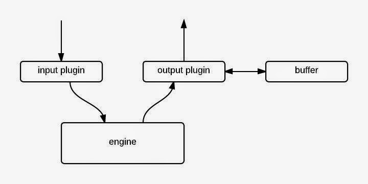 입력은 input plugin을 통해서 들어와 engine을 거쳐서 buffer plugin을 거치지 않고 output plugin으로 나간다. buffer는 engine에서 사용되는 것이 아니라 output plugin 내부에서 사용된다. 왜냐하면, output의 종류에 따라서 buffer가 필요하지 않은 경우가 있어, buffer의 사용 여부를 output plugin이 결정해야 하기 때문이다.